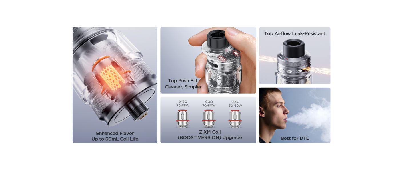Ενισχυμένη γεύση με διάρκεια ζωής αντίστασης έως 60ml υγρού, σύστημα γεμίσματος από επάνω τύπου push για πιο καθαρή και απλή χρήση, top airflow με αντοχή στις διαρροές, αναβαθμισμένες αντιστάσεις Z XM (Boost έκδοση) σε 0.15Ω (70–85W), 0.2Ω (70–80W) και 0.4Ω (50–60W), ιδανικό για απευθείας πνευμονική τζούρα (DL).