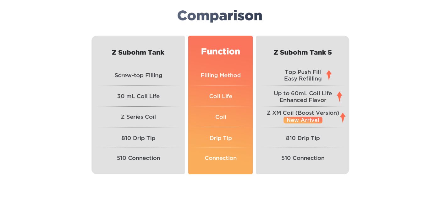 Σε σχέση με τον κλασικό Z Subohm Tank, η νέα έκδοση διαθέτει σύστημα γεμίσματος top push για πιο εύκολη αναπλήρωση, αυξημένη διάρκεια ζωής αντίστασης έως 60ml με βελτιωμένη απόδοση γεύσης και νέες αναβαθμισμένες αντιστάσεις Z XM (Boost Version), διατηρώντας το 810 drip tip.