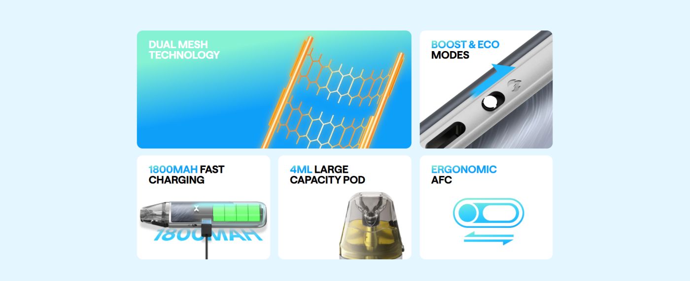 Το NeXLIM GO διαθέτει τεχνολογία Dual Mesh για βελτιωμένη απόδοση γεύσης και μεγαλύτερη διάρκεια ζωής της αντίστασης. Υποστηρίζει λειτουργίες Boost και Eco, προσφέροντας ευελιξία ανάλογα με το στυλ ατμίσματος και την αυτονομία που επιθυμείς.