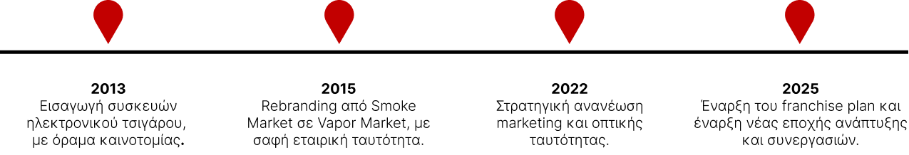 Η πρόταση franchise των Vapor Market αντιπροσωπεύει τη συμμετοχή σε ένα καταξιωμένο brand, σε ένα δοκιμασμένο επιχειρηματικό μοντέλο και σε μια εμπειρία που επαναπροσδιορίζει το retail στο άτμισμα, δημιουργώντας το μέλλον του premium vaping, τόσο ως επενδυτική ευκαιρία, όσο και ως επιλογή αυτο-απασχόλησης.